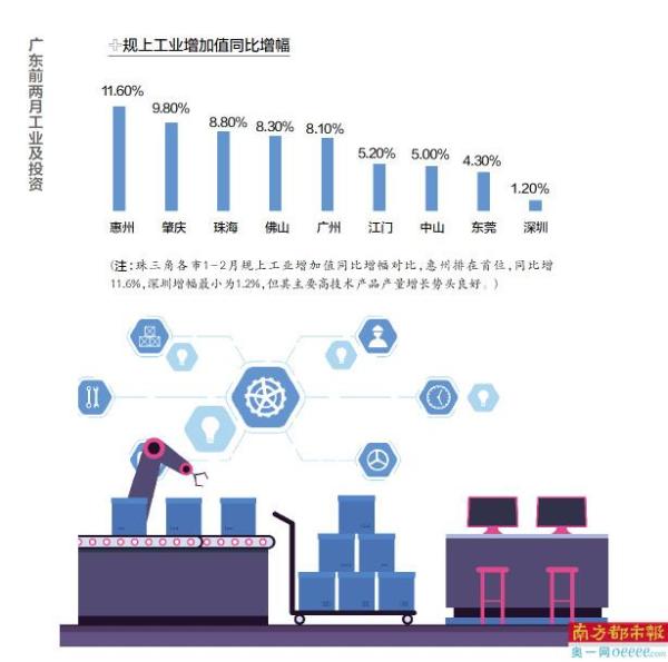 众所周知,在拉动中国经济的三大产业中,大型工业企业在其中占有特殊地位,而投资更是直接影响GDP发展水平。目前,珠三角九座城市的GDP总和占全省GDP的比重已超过八成。珠三角开年稳了,广东就稳了。为此,南都记者统计了珠三角九市1-2月的经济指标,并着重对规上工业增加值及固定资产投资(包括工业投资)进行了对比。结果显示,在整个珠三角实现稳中有升的局面下,今年刚刚迈入万亿工业大市行列的惠州,多个指标领跑全省,一个新的工业强市正在崛起。