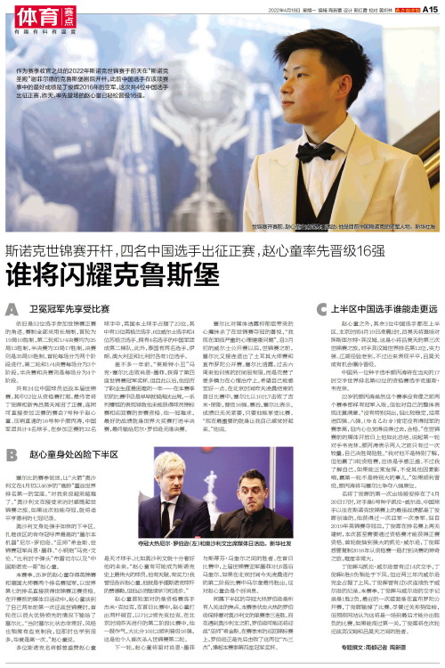 作为赛季收官之战的2022年斯诺克世锦赛于前天在“斯诺克圣殿”谢菲尔德的克鲁斯堡剧院开杆。此前中国选手在该项赛事中的最好成绩是丁俊晖2016年的亚军。这次共4位中国选手出征正赛,昨天,率先登场的赵心童已轻松晋级16强。