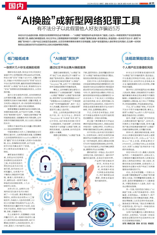 未经允许合成虚拟形象、假冒好友视频聊天到合成不雅视频……“AI换脸”视频因制作成本和技术门槛低,已成为一种颇受黑灰产欢迎的新型网络犯罪工具。南都记者调查发现,在社交平台上简单搜索就可找到提供“AI换脸”服务的卖家。有专家指出,除滥用这一技术的不法分子,使用“AI换脸”软件的个人用户也应注意是否造成侵权。北京京师律师事务所律师王琮玮提醒,当用户发现遭到他人侵权等非法利用时,应当第一时间采取保全证据及时向平台反映并向公安机关报案等救济措施。