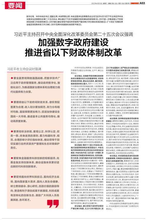 新华社电 中共中央总书记、国家主席、中央军委主席、中央全面深化改革委员会主任习近平4月19日下午主持召开中央全面深化改革委员会第二十五次会议,审议通过了《关于加强数字政府建设的指导意见》、《关于进