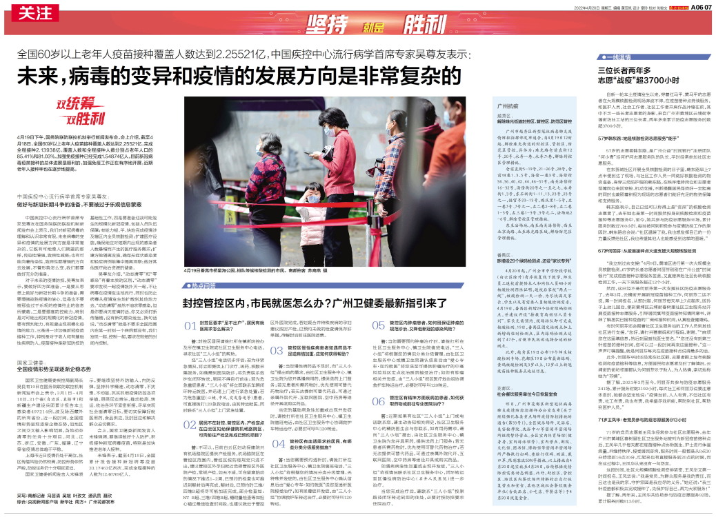 4月19日下午,国务院联防联控机制举行新闻发布会。会上介绍,截至4月18日,全国60岁以上老年人疫苗接种覆盖人数达到2.25521亿,完成全程接种2.13938亿,覆盖人数和全程接种人数分别占老年