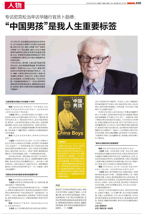 人物名片 卜励德(Nicholas Platt),尼克松访华团中最年轻的随行官员之一。他自上世纪60年代开始学习中文,后来从事外交工作逾三十年,曾被尼克松称为“中国男孩”。1973年,他被派往中