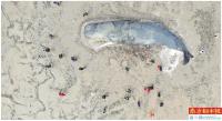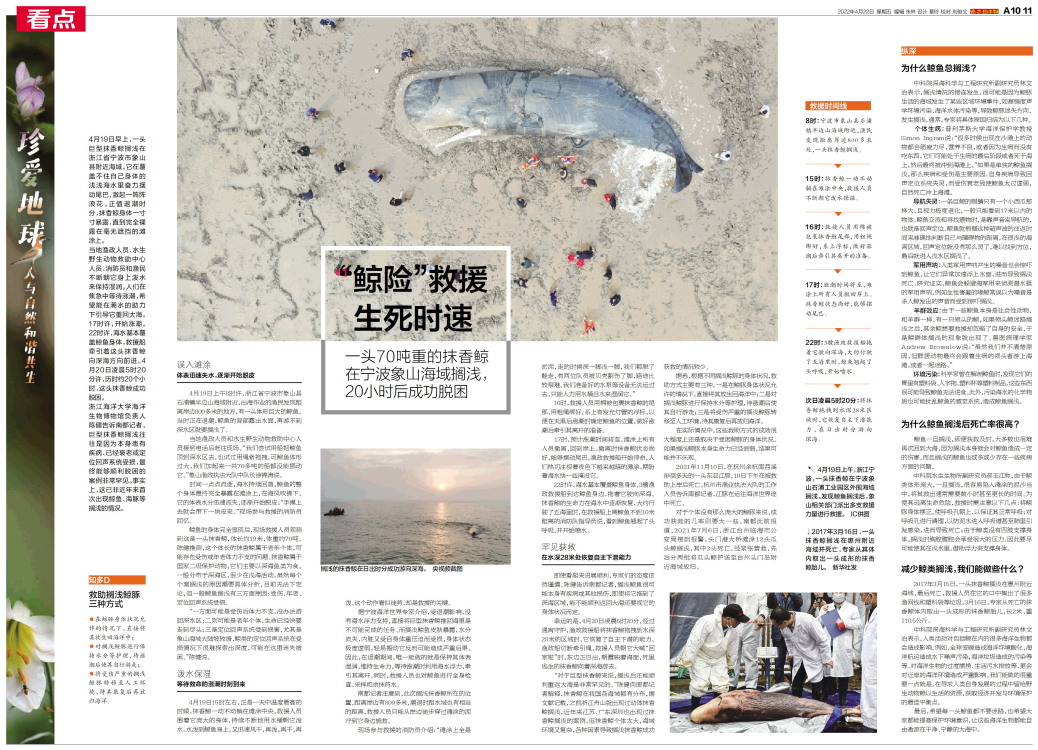 4月19日早上,一头巨型抹香鲸搁浅在浙江省宁波市象山县附近海域。它在覆盖不住自己身体的浅浅海水里奋力摆动尾巴,激起一阵阵浪花。正值退潮时分,抹香鲸身体一寸寸暴露,直到完全裸露在毫无遮挡的滩涂上。当