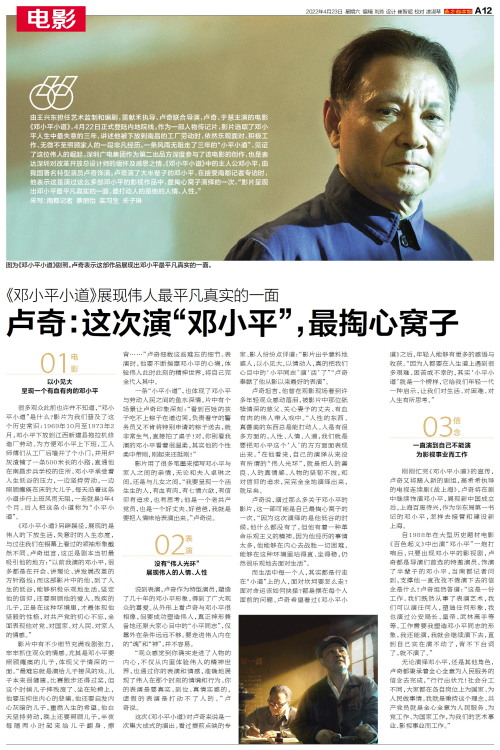 由王兴东担任艺术监制和编剧,雷献禾执导、卢奇联合导演,卢奇、于慧主演的电影《邓小平小道》,4月22日正式登陆内地院线。作为一部人物传记片,影片选取了邓小平人生中最失意的三年,讲述他被下放到南昌的工