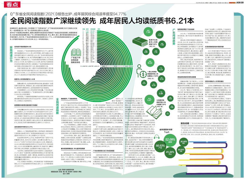 全民阅读指数广深继续领先 成年居民人均读纸质书6.21本