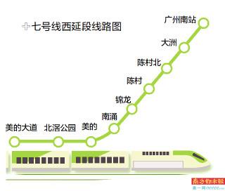 七号线西延段全长13.4公里,其中顺德区段长约11.8公里,广州区段长约1.6公里,共设8座地下站,分别为美的大道、北滘公园、美的、南涌、锦龙、陈村、陈村北、大洲,其中北滘公园未来与佛山三号线换乘,陈村与城际铁路广佛环线换乘,陈村北未来与佛山十一号线换乘。