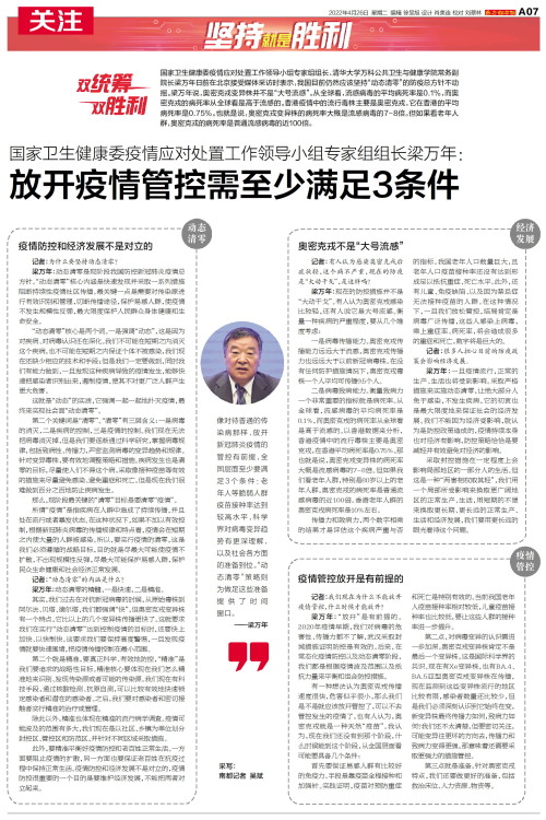 国家卫生健康委疫情应对处置工作领导小组专家组组长、清华大学万科公共卫生与健康学院常务副院长梁万年日前在北京接受媒体采访时表示,我国目前仍然应该坚持“动态清零”的防疫总方针不动摇。梁万年说,奥密克戎