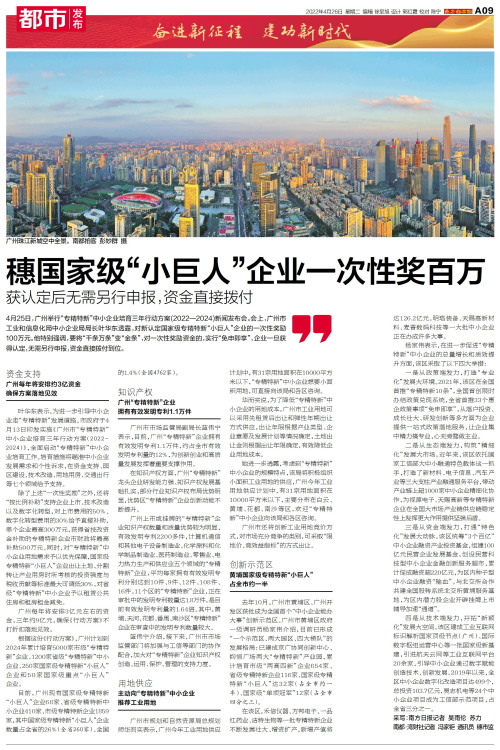 4月25日,广州举行“专精特新”中小企业培育三年行动方案(2022—2024)新闻发布会。会上,广州市工业和信息化局中小企业局局长叶华东透露,对新认定国家级专精特新“小巨人”企业的一次性奖励100