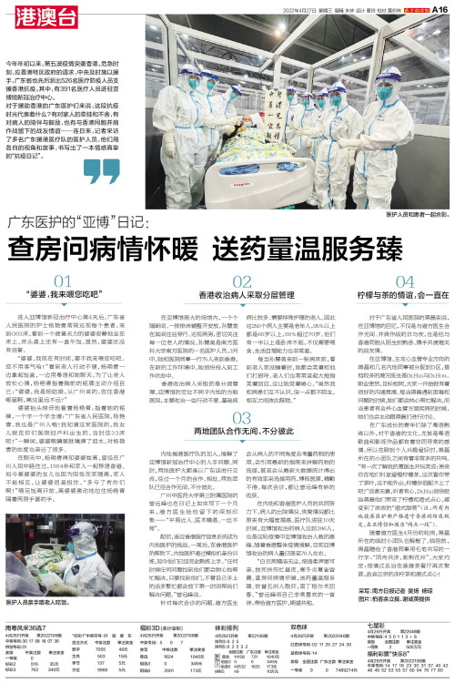 今年年初以来,第五波疫情突袭香港。危急时刻,应香港特区政府的请求,中央及时施以援手,广东省也先后派出526名医疗防疫人员支援香港抗疫。其中,有391名医疗人员进驻亚博馆新冠治疗中心。 对于援助香