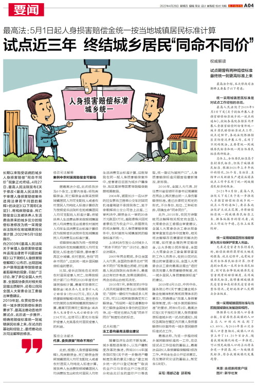 2019年起,在贯彻党中央统一城乡居民赔偿标准的要求下,最高法推动各地开展试点,此后进一步推开,明确将赔偿标准统一到城镇居民标准上来。在试点的基础和经验上,最终推动此次司法解释的修改。