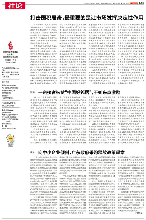 来论 广东日前印发《关于进一步加强政府采购促进中小企业发展的通知》,表示要通过预留政府采购项目中的份额比例、加大政策倾斜力度、发挥公共服务属性、优化支付融资服务等四个方面的主要措施,为中小企业参