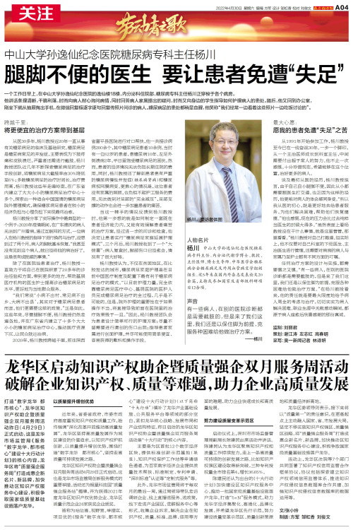 “我们常说‘小病不出村、常见病不出乡、大病不出县’,其实对于糖尿病足患者而言,他们更需要这样的政策。”正是如此,这些年来,尽管腿脚不便,杨川教授仍然走遍各地,并在广东省内建立了十多个大大小小的糖尿病足治疗中心,推动医疗资源下沉,让民众就近治病。