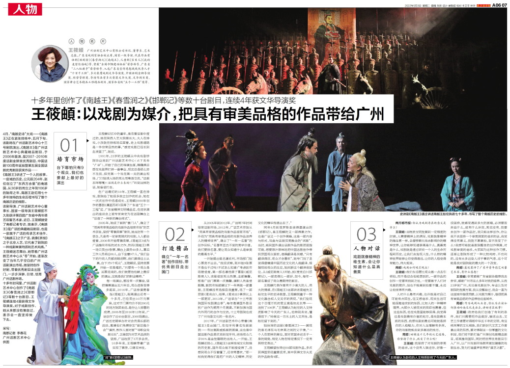 十多年时间里,广州话剧艺术中心创作了《南越王》《春雪润之》《邯郸记》等数十台剧目,王筱頔连续4届获得文华导演奖。对于戏剧创作,她从来都没有懈怠过,表示会一直坚持做下去。