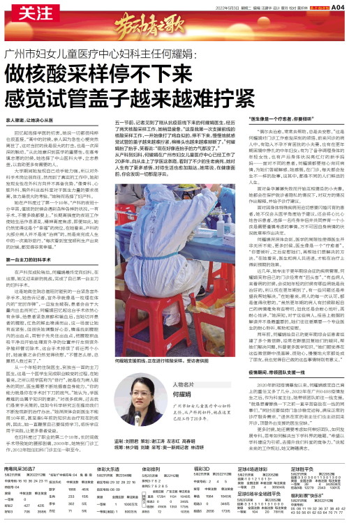 人物名片 何耀娟 广州市妇女儿童医疗中心妇科主任,从产科到妇科,她在这里已经工作了20多年。 五一节前,记者见到了刚从抗疫前线下来的何耀娟医生,经历了两天核酸采样工作,她稍显疲惫,“这是我第