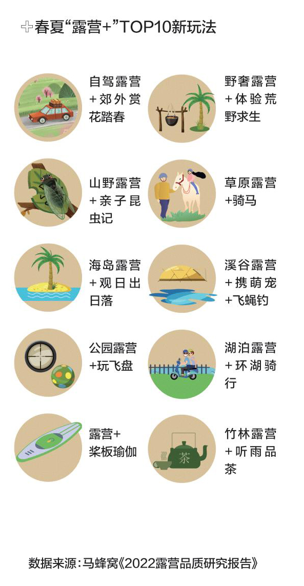 杨彦锋还提及了露营对公共环境层面的影响,例如产生噪音扰民、垃圾污染环境等,“露营中用火用电涉及的便携装备等,其使用安全性也需要予以规范。”另外还有业内人士指出,露营产品参差不齐、缺乏标准,营地土地的资质与合规问题,露营消费“照骗”现象层出不穷等,都有待解决。