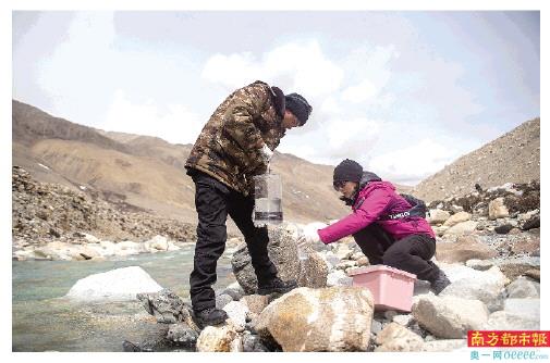东绒布冰川区域,科考人员采集微生物指标水样。