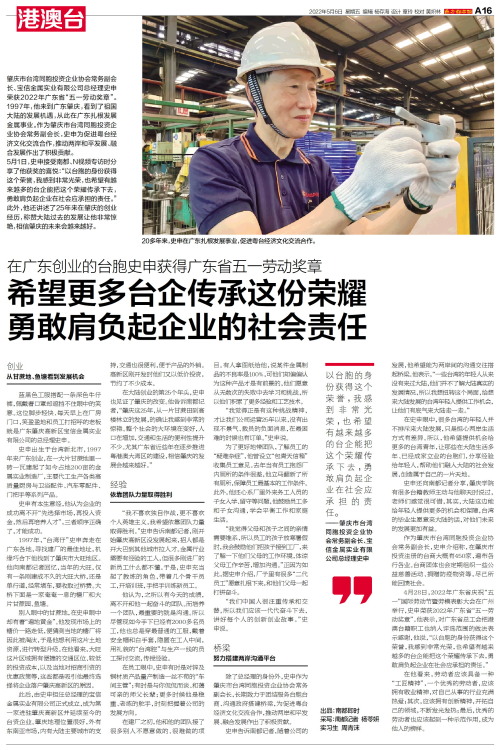 肇庆市台湾同胞投资企业协会常务副会长、宝信金属实业有限公司总经理史申荣获2022年广东省“五一劳动奖章”。1997年,他来到广东肇庆,看到了祖国大陆的发展机遇,从此在广东扎根发展金属事业。作为肇庆