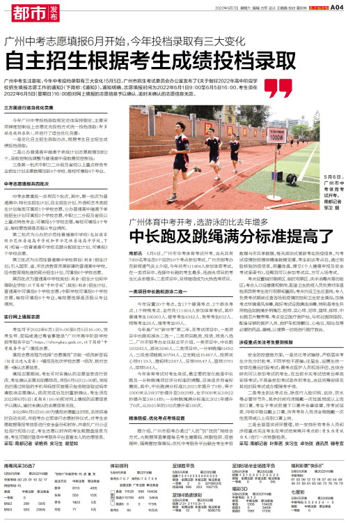 广州中考生注意啦,今年中考投档录取有三大变化!5月5日,广州市招生考试委员会办公室发布了《关于做好2022年高中阶段学校招生填报志愿工作的通知》(下简称:《通知》)。通知明确,志愿填报时间为202
