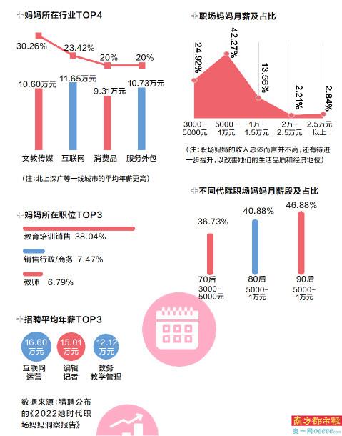 猎聘公布的《2022她时代职场妈妈洞察报告》显示,深圳等一线城市的职场妈妈优先职位的四大行业为文教传媒、互联网、消费品和服务外包,互联网平均年薪最高。在高薪段,即2.5万元以上月薪的人群中,70后职场妈妈占比最高,为6.16%;90后职场妈妈占比最低,为0.78%;80后职场妈妈居中,为2.91%。