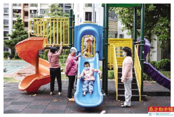 在妈妈和外婆的陪同下,小瑾瑜开心地在小区的滑梯玩耍。