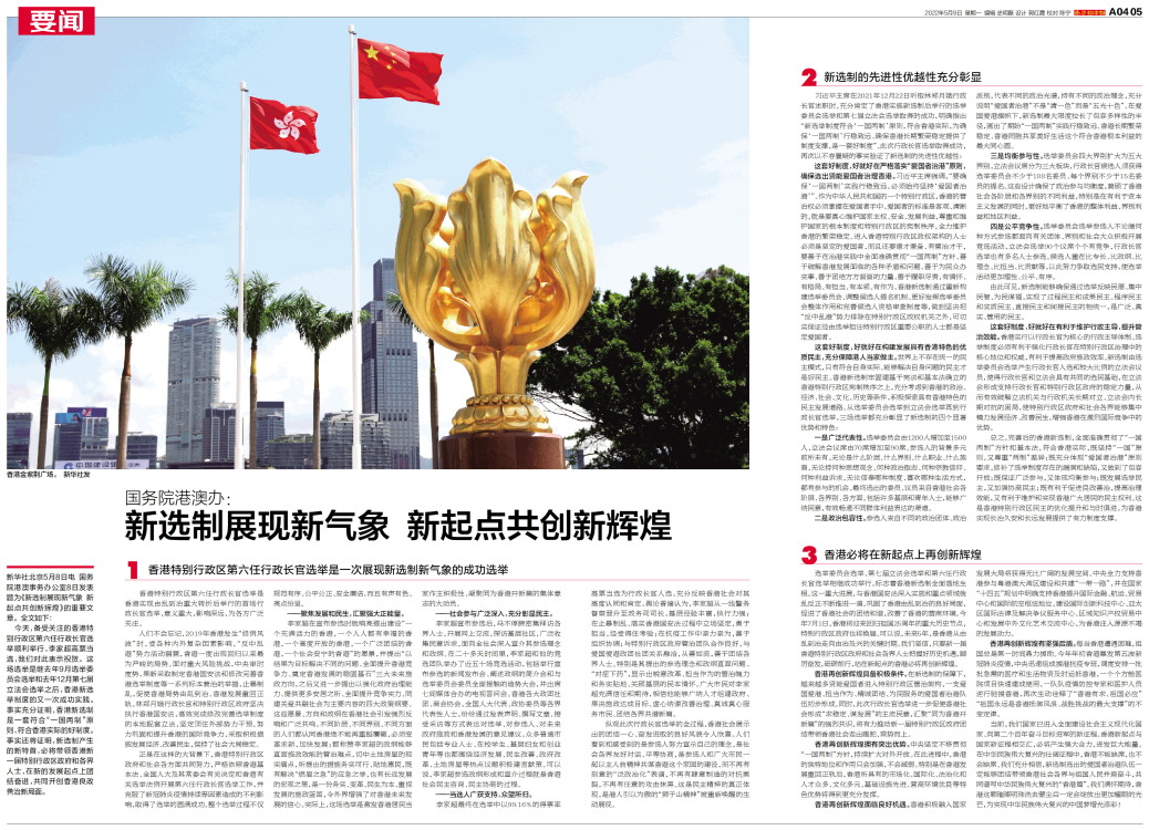 新华社北京5月8日电 国务院港澳事务办公室8日发表题为《新选制展现新气象 新起点共创新辉煌》的重要文章。全文如下: 今天,备受关注的香港特别行政区第六任行政长官选举顺利举行,李家超高票当选,我们