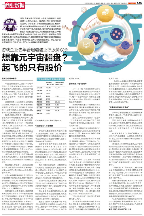近日,各大游戏公司年报、一季报均披露完毕。南都湾财社记者对40家A、H股游戏上市公司2021年财报进行了分析整理,去年游戏业监管加强,利空不断,如防沉迷新政以及连续8个月未下发版号,半数企业净利润