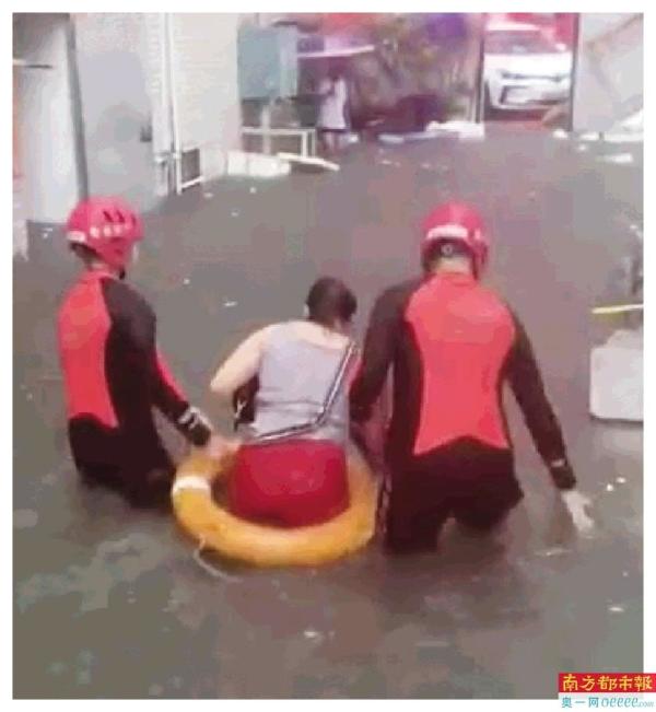 深圳宝安区,救援人员用救生圈转移市民。 视频截图