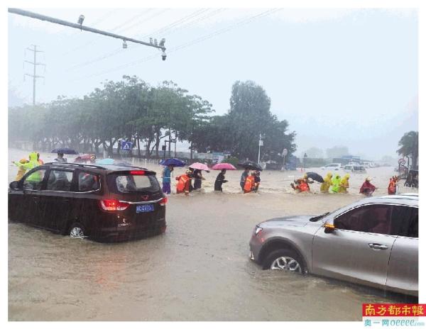 在珠海大道金龙路路段,积水没过成人膝盖,消防救援人员到达现场后,立即对附近低洼路段被困群众开展转移工作。现场大雨滂沱,积水颇深,行走困难,消防救援人员看到一名阿姨行走不便,立即背起阿姨往路边高地段走去。