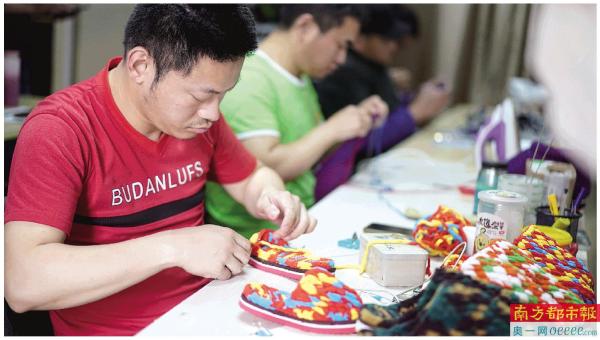 在南京玄武九洲残疾人文化艺术中心,几名残疾人在制作手工产品。 新华社发