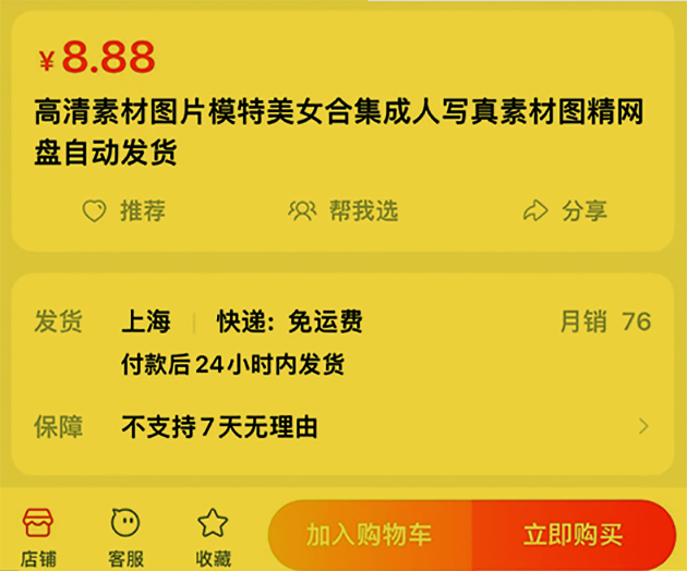 南都记者实测发现,在电商平台以“美女合集”为关键词检索,出现商家出售海量个人照片,商品描述多为“一次性获取美女素材”“高清写真合集”“百人合集”,价格从两元到二三十元不等,其中多在10元以下,照片素材从几百G到几千G不等。