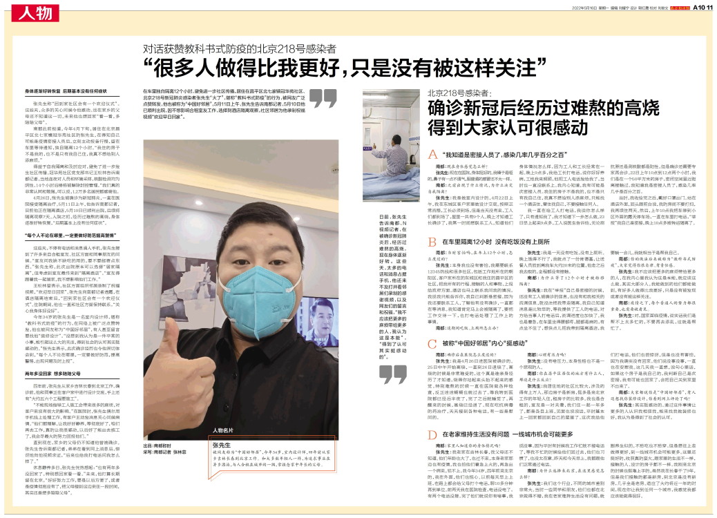 日前,张先生告诉南都、N视频记者,在被确诊新冠肺炎后,经历过难熬的高烧,现在身体逐渐好转。这些天,太多的电话和消息占据手机,他还来不及打开看邻居们录制的感谢视频,以及网友们的留言和祝福,“我不应该