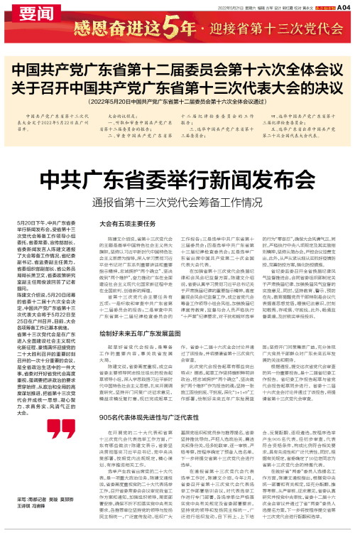 中国共产党广东省第十三次代表大会定于2022年5月22日在广州召开。 大会的议程是: 一、听取和审查中国共产党广东省第十二届委员会的报告; 二、审查中国共产党广东省第十二届纪律检查委员会的工
