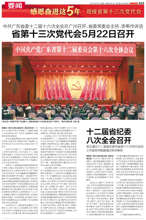 南都讯 南方日报记者徐林 通讯员岳宗 5月20日,中国共产党广东省第十二届委员会第十六次全体会议在广州召开。省委委员、省委候补委员出席全会。 全会由省委常委会主持,省委书记李希作讲话。全会决定,