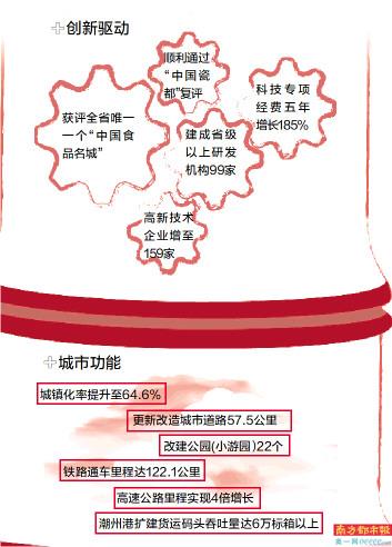 2020年10月,习近平总书记亲临潮州视察,给予潮州广大干部群众最亲切的关心关怀、最有力的指引指导和最强大的精神动力。五年来,潮州紧紧围绕“把潮州建设得更加美丽”发展目标和“打造沿海经济带上的特色精品城市”发展定位,经济社会发展取得新的阶段性成就,GDP年均增长5.3%,总量突破千亿大关,人均生产总值达4.9万元。千亿陶瓷等产业集群加快建设,顺利通过“中国瓷都”复评,获评全省唯一一个“中国食品名城”称号……不负总书记的殷切嘱托和深情厚望。