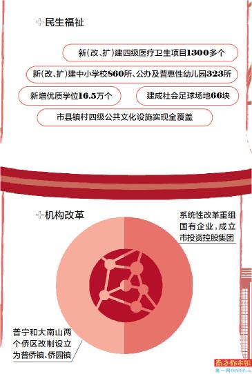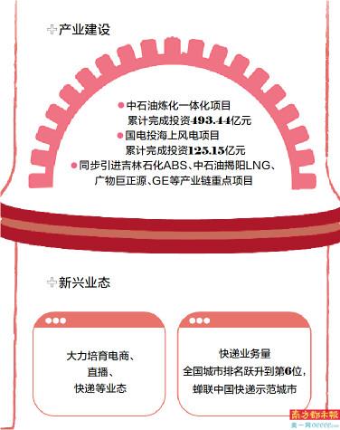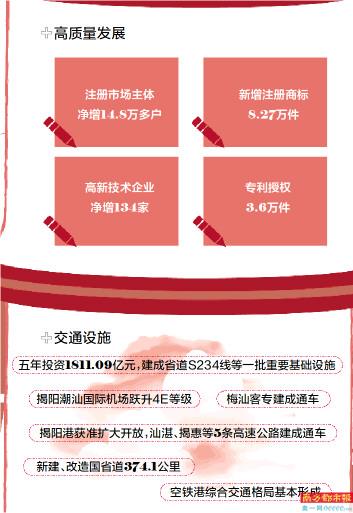 揭阳认真落实省委工作部署和省委对揭阳发展的定位要求,抢抓机遇,应对挑战,五年来,聚焦“一城两园”,聚力打造绿色石化、海上风电两大产业,产业建设取得新进展。电商、直播、快递等新兴业态发展迅速,快递业务量从全国城市排名第15位跃升到第6位,蝉联中国快递示范城市。随着一批重要基础设施升级,揭阳潮汕国际机场跃升4E等级,梅汕客专建成通车,揭阳港获准扩大开放,空铁港综合交通格局基本形成。活力古城、滨海新城、产业强市建设迈出了坚实步伐。
