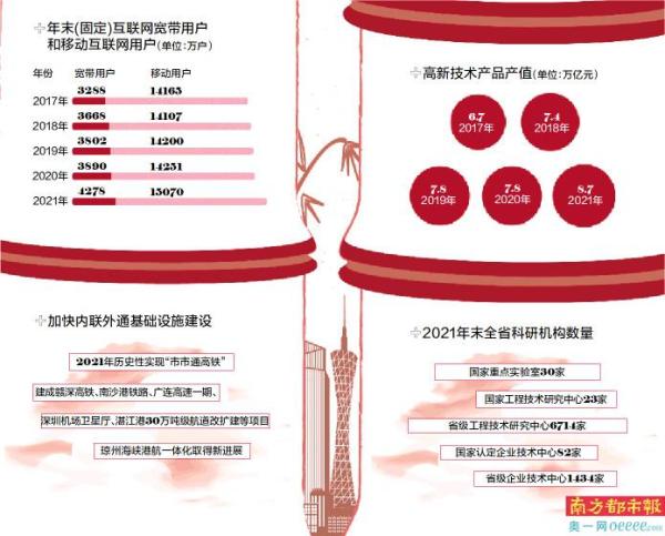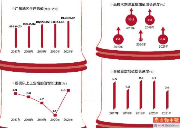 广东省牢记嘱托、感恩奋进,以习近平新时代中国特色社会主义思想为指导,认真贯彻习近平总书记、党中央决策部署,按照国务院工作安排,在省委的正确领导下,在省人大及其常委会、省政协的监督支持下,完整、准确、全面贯彻新发展理念,深入落实省委“1+1+9”工作部署,用好“大学习、深调研、真落实”工作方法,扎实打造新发展格局战略支点,坚定不移推动高质量发展,以新担当新作为推动经济社会发展迈上新台阶。2021年全省地区生产总值达12.4万亿元、同比增长8%,东莞成为我省第四个经济总量过万亿元城市,全省地方一般公共预算收入达1.4万亿元、增长9.1%,进出口总额突破8万亿元、增长16.7%,金融业增加值突破1万亿元,顺利完成省十三届人大四次会议确定的年度主要目标任务,实现“十四五”良好开局。