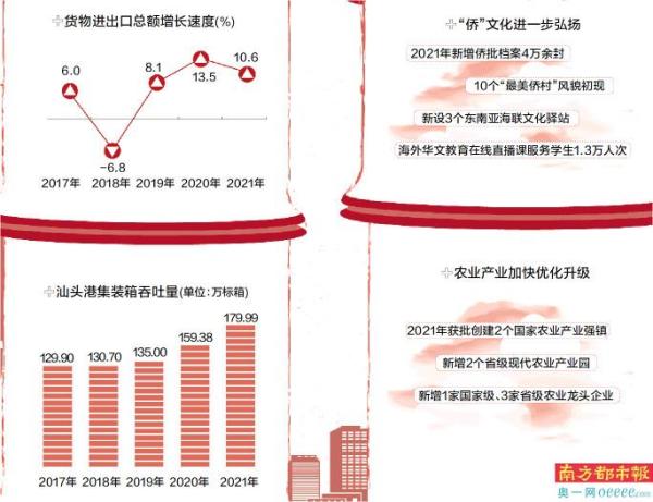 过去五年,汕头坚持以习近平新时代中国特色社会主义思想为指导,深入学习贯彻党的十九大和十九届历次全会精神,全面落实“1+1+9”工作部署,深化推进“1146”工程,经济建设和社会事业取得明显进步。经济综合实力稳步提升,预计地区生产总值年均增长6%,来源于汕头市的财政收入年均增长9.4%,规模以上工业增加值年均增长6.4%,全社会研发经费投入年均增长17.6%。重大项目投资显著提速,固定资产投资五年累计完成超1万亿元,重大基础设施建设捷报频传,动车开进汕头市区,广汕汕高铁全面铺开建设,广澳港区二期工程投入运营,潮惠、揭惠、汕湛、潮汕环线高速公路建成通车。改革开放水平持续提高,国家高新区、综保区、跨境电子商务综合试验区、市场采购贸易方式试点、区域性国际通信业务出入口局相继获批,省专门出台政策支持汕头建设现代化活力经济特区、支持华侨试验区高质量发展,汕特、澄海、潮阳、南澳4家农信联社成功改制为农商行。城乡生态环境明显提质。保障改善民生不断提效。