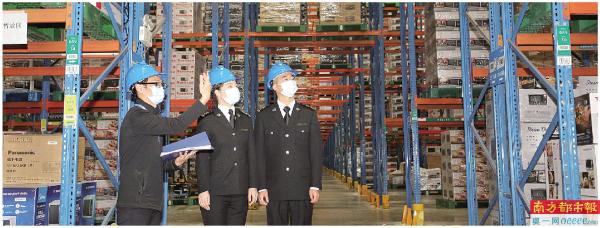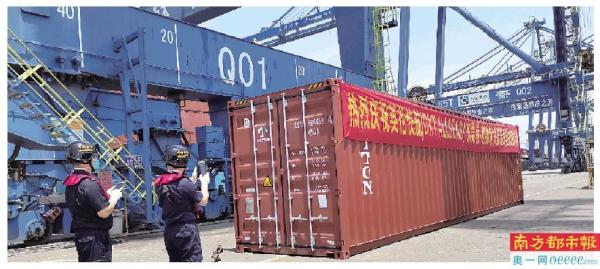 东莞港开通首条远洋集装箱班轮航线,沙田海关关员监管货物出口。 濮宣 摄