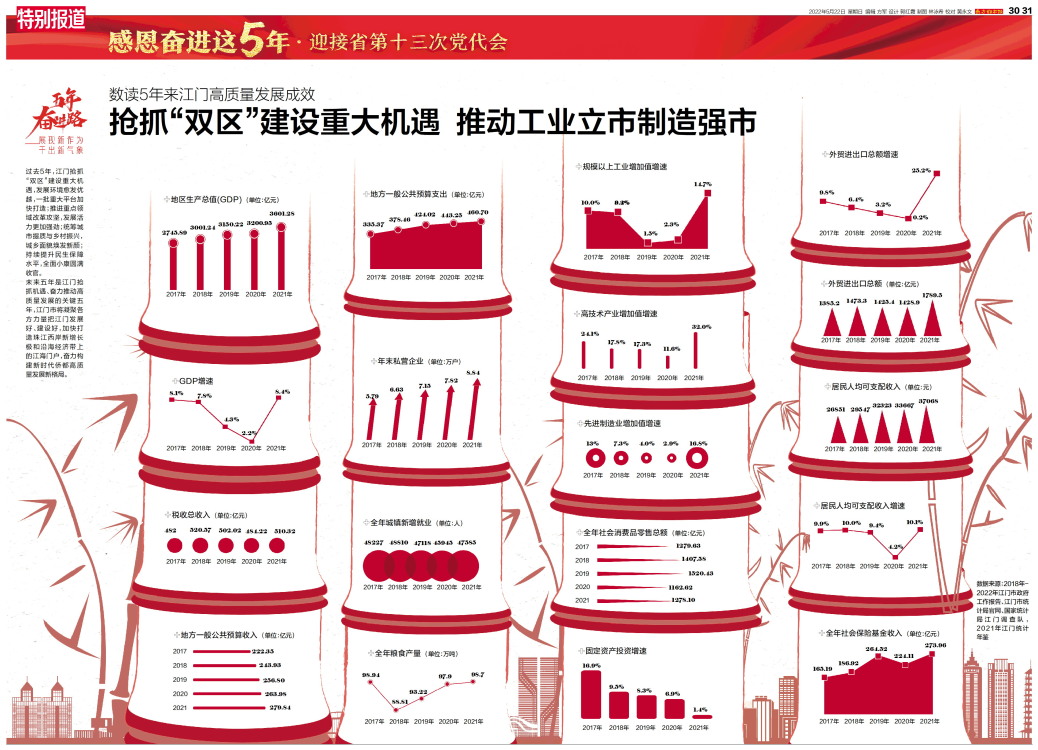 过去5年,江门抢抓“双区”建设重大机遇,发展环境愈发优越,一批重大平台加快打造;推进重点领域改革攻坚,发展活力更加强劲;统筹城市提质与乡村振兴,城乡面貌焕发新颜;持续提升民生保障水平,全面小康圆满