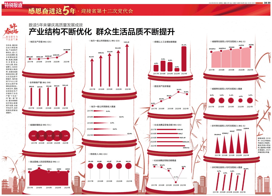 五年来,肇庆综合实力明显增强。产业结构不断优化,进入工业化加速期;城乡发展成效显著,高速公路通车总里程达695公里、排全省第七;生态环境质量大幅改善,全面完成能耗双控目标;群众生活品质不断提升,每