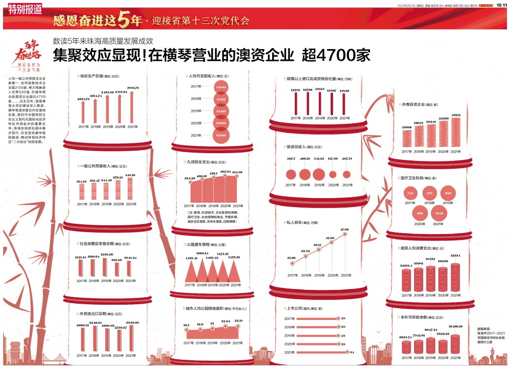 人均一般公共预算支出全省第一、全市高新技术企业超2100家、格力电器进入世界500强、在横琴营业的澳资企业超过4700家......过去五年,是粤港澳大湾区建设深入推进、横琴粤澳深度合作区落地实施