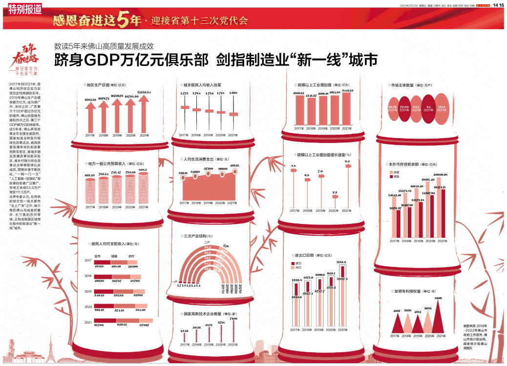 2017年到2021年,是佛山经济综合实力实现历史性跨越的五年。2019年佛山生产总值突破万亿元,成为继广州、深圳之后,广东第三个GDP超过万亿元的城市。佛山也是继无锡和苏州之后,第三个GDP破万