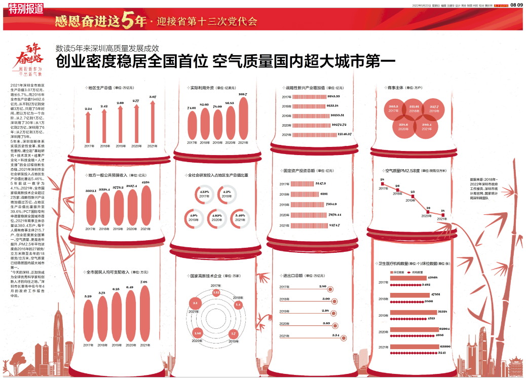 2021年深圳全市地区生产总值3.07万亿元、增长6.7%。而2016年全市生产总值19492.6亿元,从不到2万亿到突破3万亿,只用了5年时间。若以万亿为一个台阶,从2.7亿到1万亿,深圳用了3