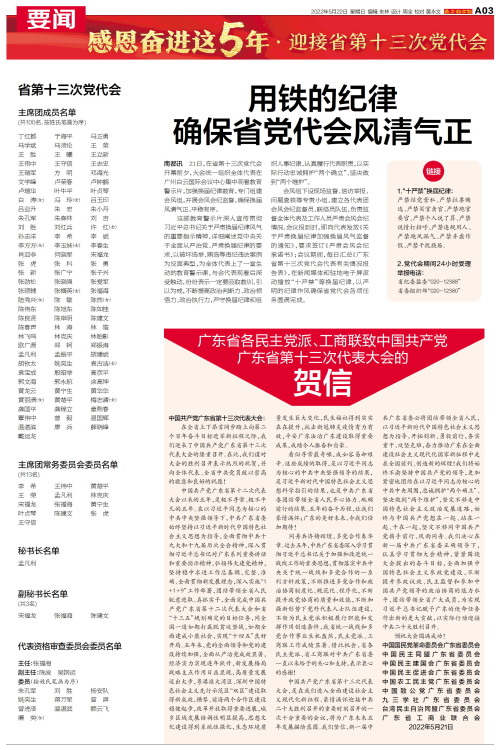 中国共产党广东省第十三次代表大会: 在全省上下昂首阔步踏上向第二个百年奋斗目标进军新征程之际,我们迎来了中国共产党广东省第十三次代表大会的隆重召开。在此,我们谨对大会的胜利召开表示热烈的祝贺,并