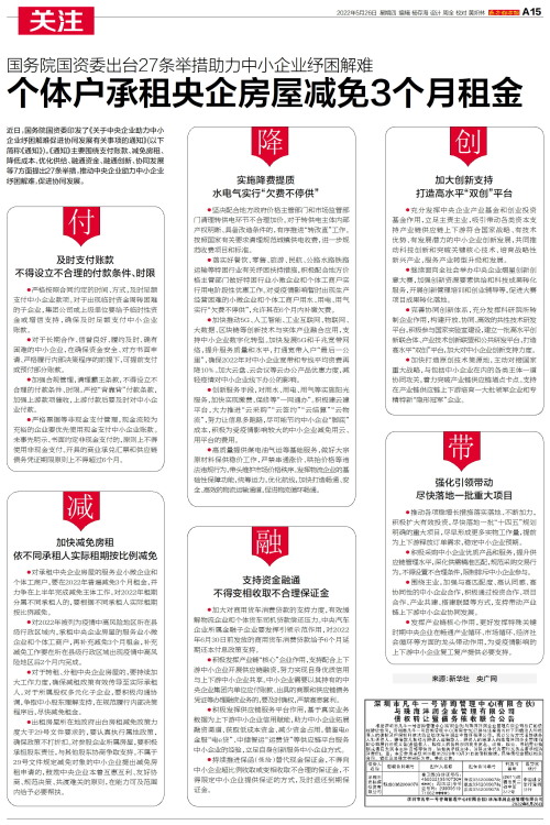 近日,国务院国资委印发了《关于中央企业助力中小企业纾困解难促进协同发展有关事项的通知》(以下简称《通知》)。《通知》主要围绕支付账款、减免房租、降低成本、优化供给、融通资金、融通创新、协同发展等7