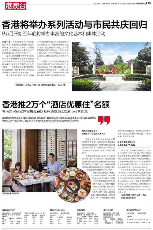 香港旅游发展局(旅发局)推出“夏日同赏 就在香港”,鼓励市民以多角度发掘和欣赏香港。5月24日起,香港旅发局推出2万个“酒店优惠住”的名额,符合资格的香港居民可向酒店预订;名额有限,先到先得。约1