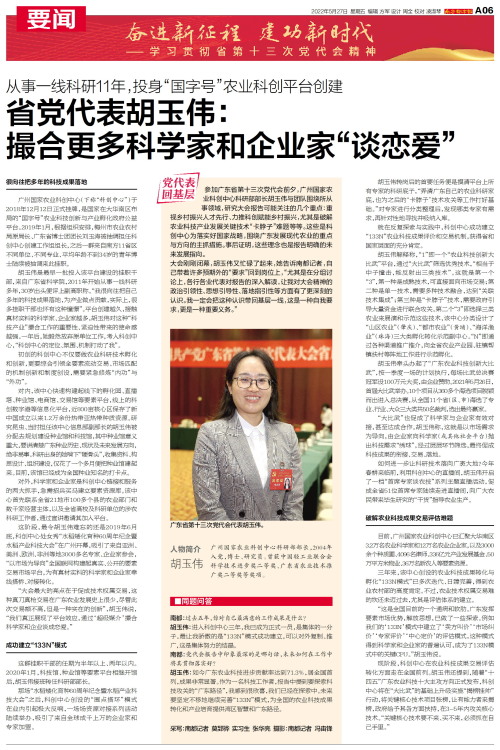 广东省第十三次党代会代表胡玉伟。 人物简介 胡玉伟 广州国家农业科创中心科研部部长,2004年入党,博士、研究员。曾获中国轻工业联合