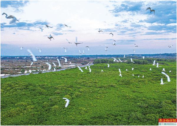 落日余晖里,数十只白鹭在湛江高桥红树林保护区盘旋,颇为壮观。 南方日报记者 吴明 摄