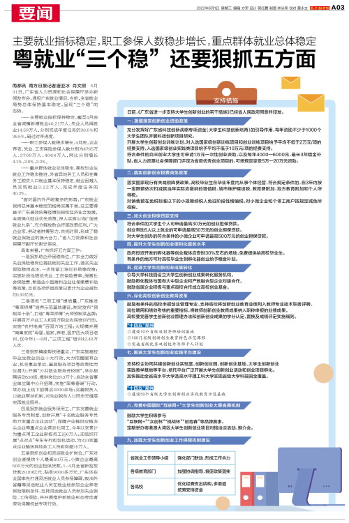 南都讯 南方日报记者唐亚冰 肖文舸 5月31日,广东省人力资源和社会保障厅举办新闻发布会,通报广东就业情况。当前,全省就业局势总体保持基本稳定,呈现“三个稳”的态势。 ——主
