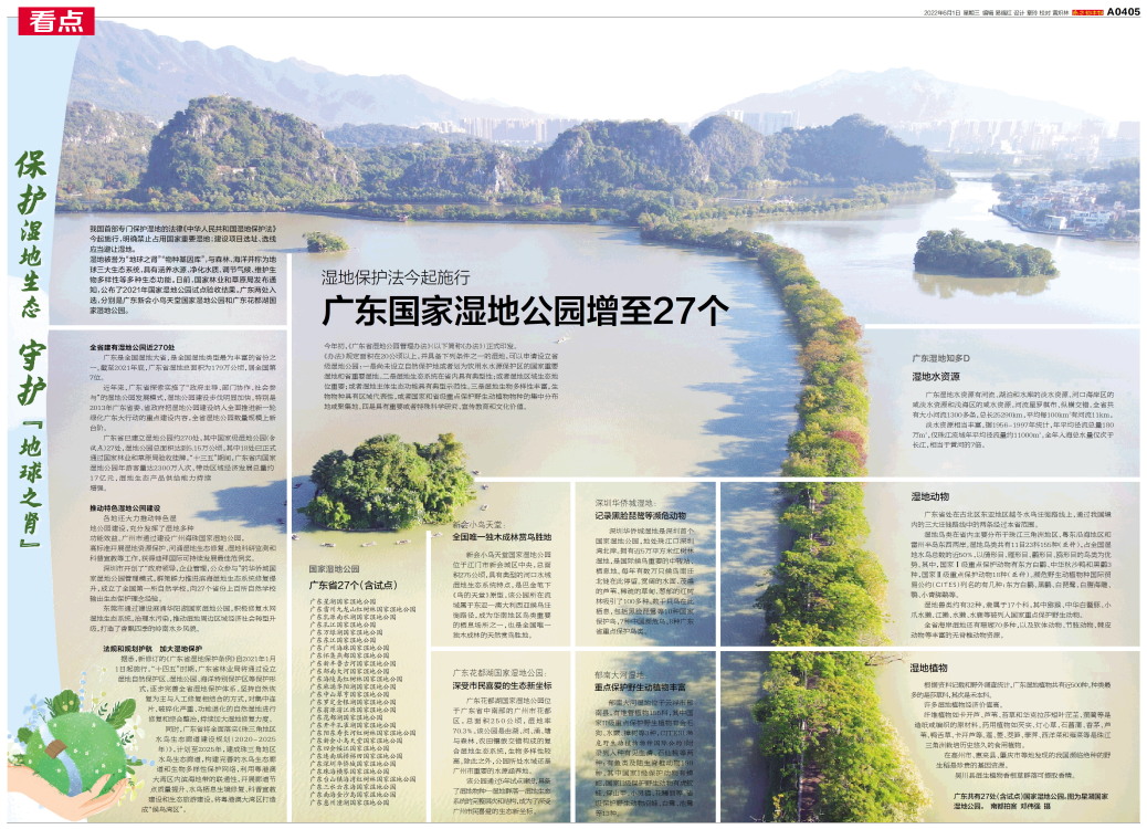 广东共有27处(含试点)国家湿地公园。图为星湖国家湿地公园。 南都拍客 邓伟强 摄 我国首部专门保护湿地的法律《中华人民共和国湿地保护法》今
